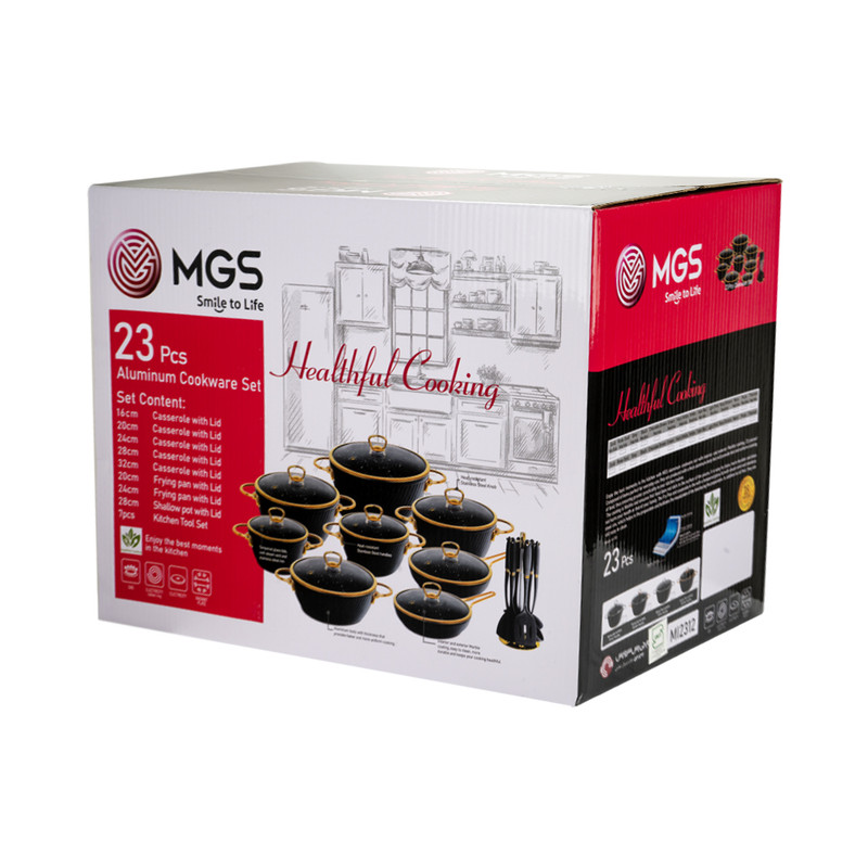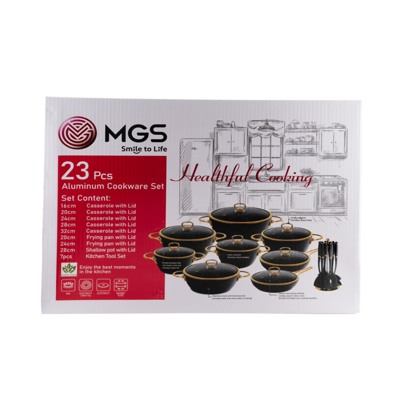 سرویس قابلمه 23 پارچه فورج طرح ماینز سری سوم یک سرویس ظروف پخت و پز عالی برای هر سلیقهای است. این ست شامل پنچ قابلمه در سایزهای 16/20/24/28/32، یک تابه دو دسته سایز 28 و دو تابه تک دسته سایز 24 و 20 و یک ست کفگیر و ملاقه 7 پارچه است.