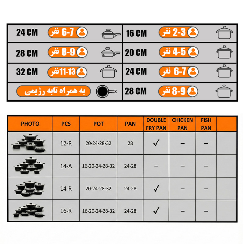 این سرویس شامل قابلمه ها در سایز های : 16 - 20 - 24 - 28 - 32 تابه ها : 24 - 28 و همچنین یک عدد تابه رژیمی است که نیاز های مختلف آشپزی روزمره و رژیمی را به طول کامل پوشش میدهد..