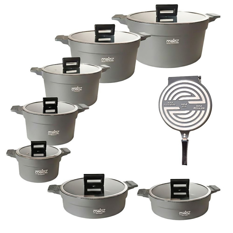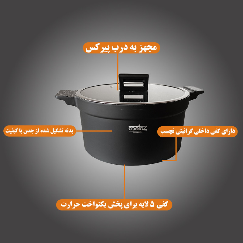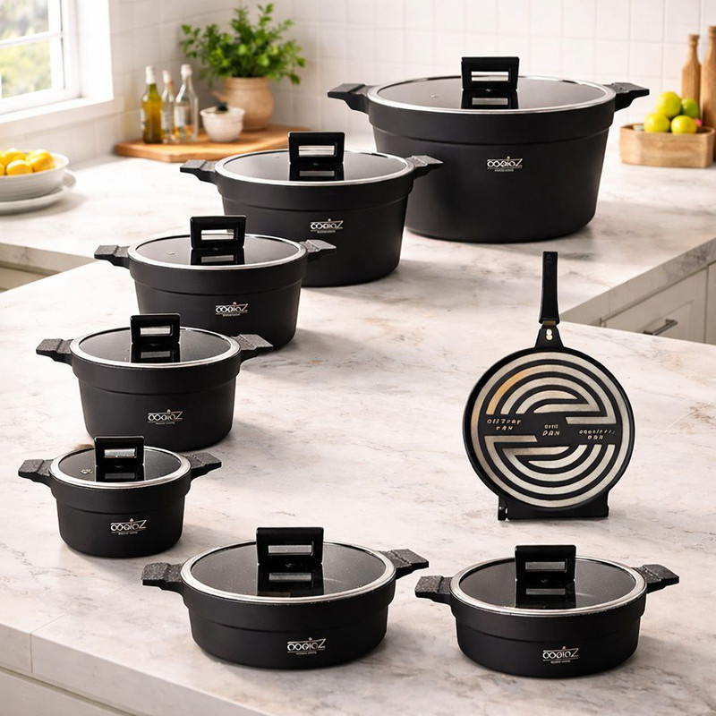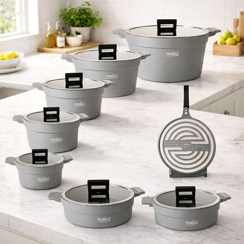 سرویس قابلمه و تابه 16 پارچه برند ماینز با بدنه ای از جنس چدن و روکش داخلی گرانیت نچسب، گزینه ای ایده آل برای آشپزی سالم، حرفه ای و با دوام بالا محسوب میشود.
