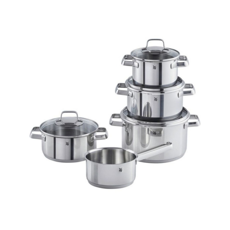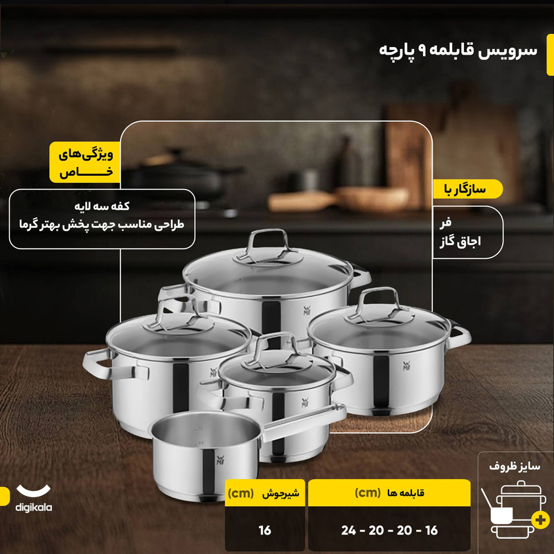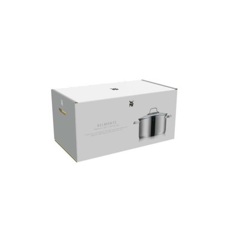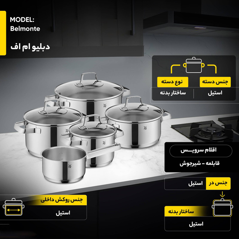 سرویس ۹ پارچه WMF Belmonte ترکیبی حرفهای و باکیفیت از استیل ضدزنگ Cromargan ساخت آلمان است که شامل چهار قابلمه با دربهای شیشهای (سایزهای ۱۶، ۲۰ دو عدد، ۲۴ سانتیمتر) و یک شیرجوش ۱۶ سانتیمتری میشود. این مجموعه با چهار عدد درب مقاوم به حرارت، کاربردی کامل و متنوع را برای آشپزی روزانه فراهم میآورد.