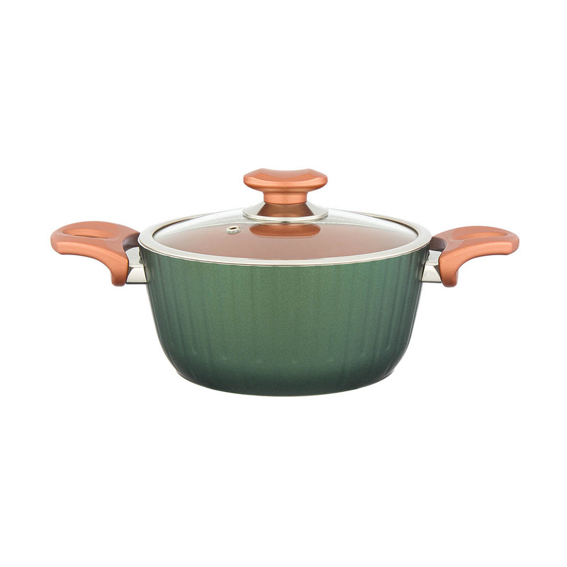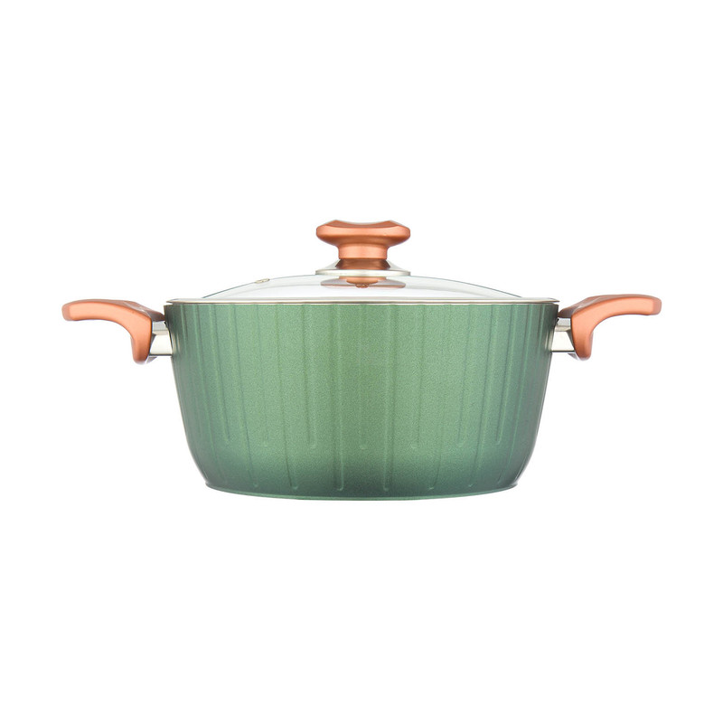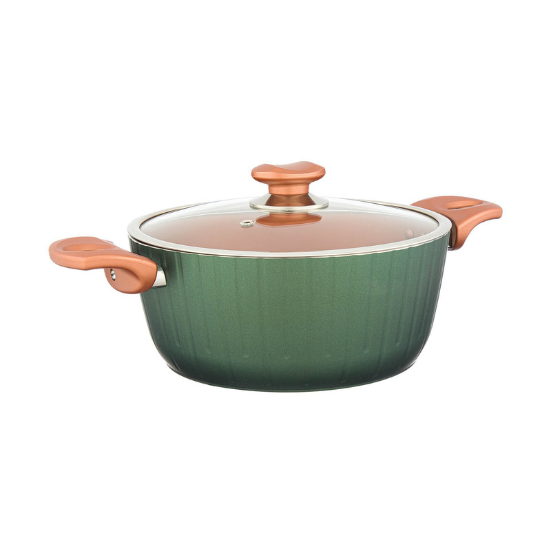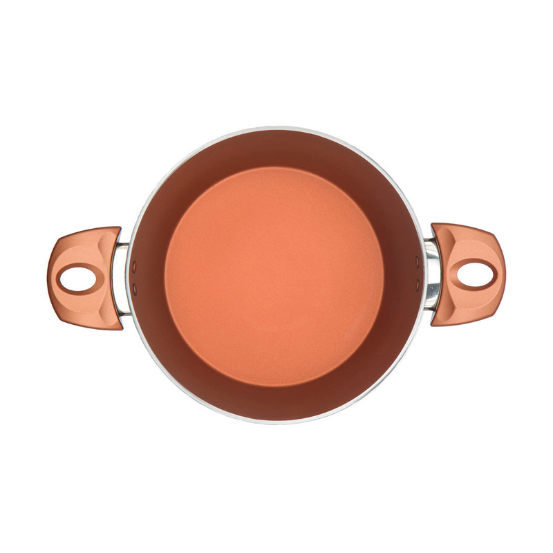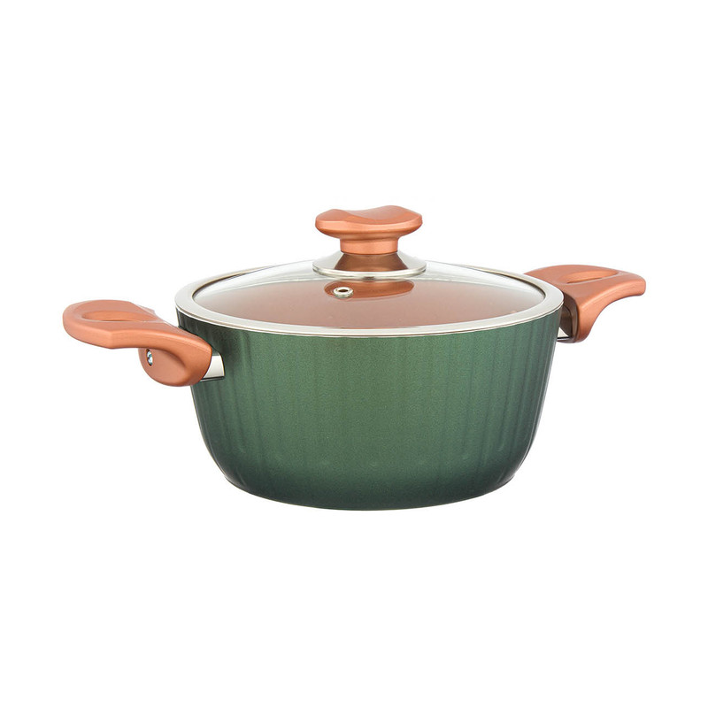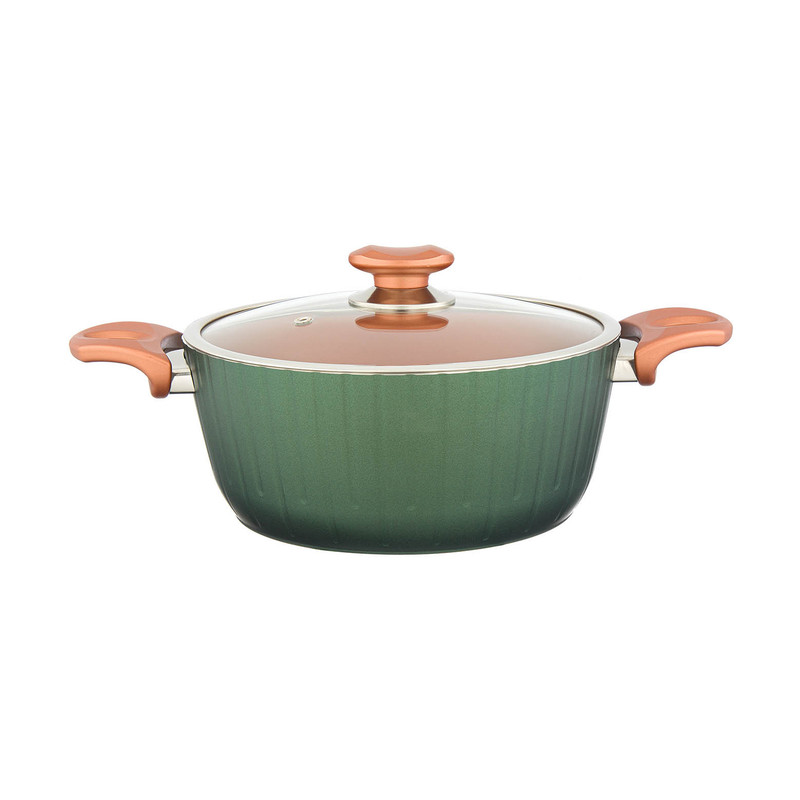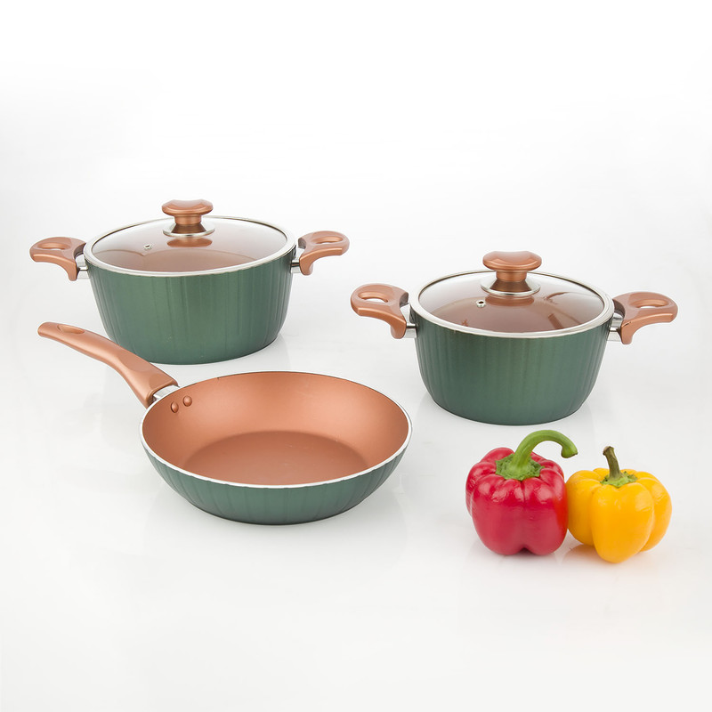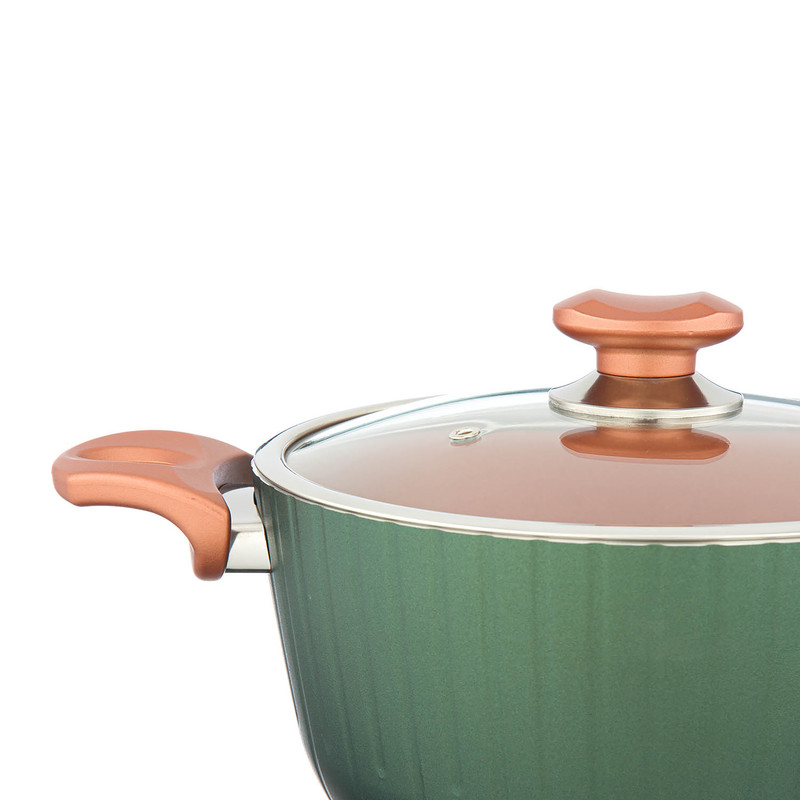 سرویس پخت و پز 5 پارچه عروس مدل دلوین شامل قابلمه های سایز 20 و 24 به همراه تابه تکدسته سایز 24 می باشد ، آلیاژ بدنه این محصول از آلومینیوم سخت به اصطلاح فورج ساخته شده و پوشش داخلی آن نیز نچسب است