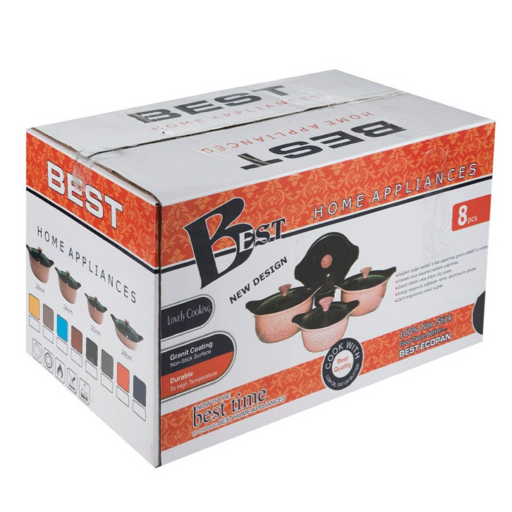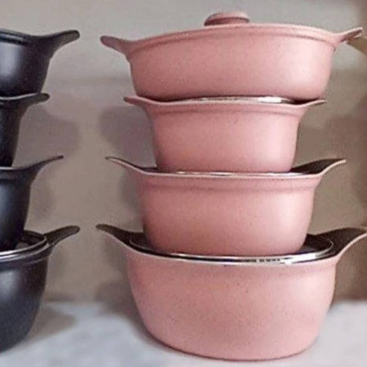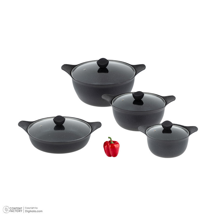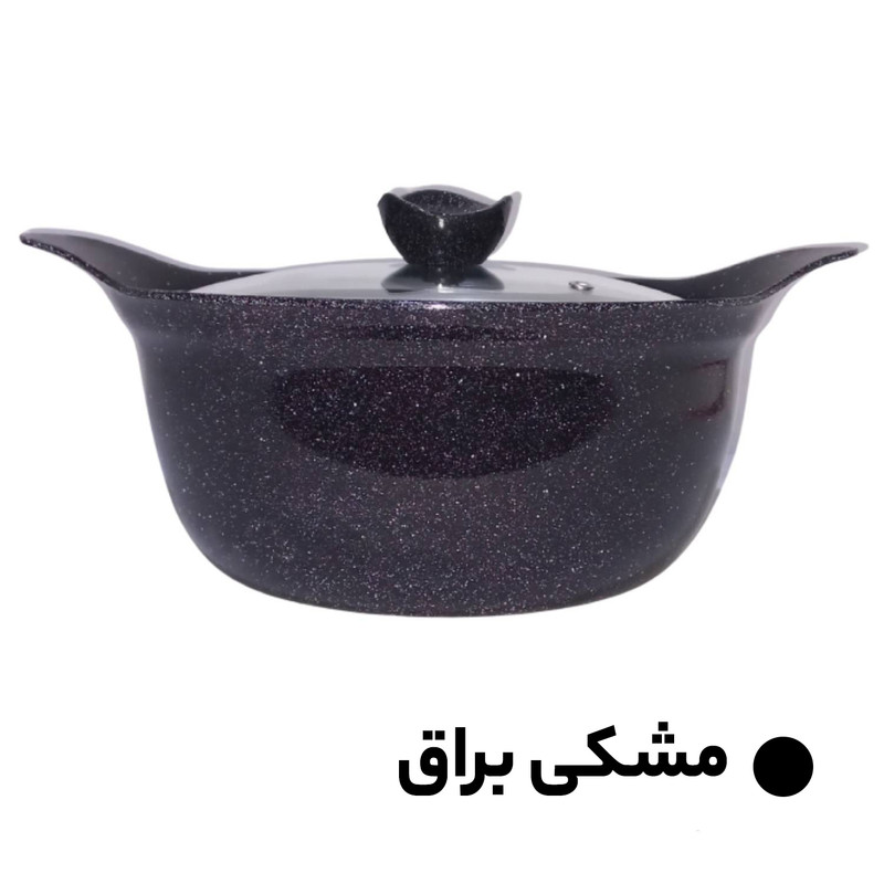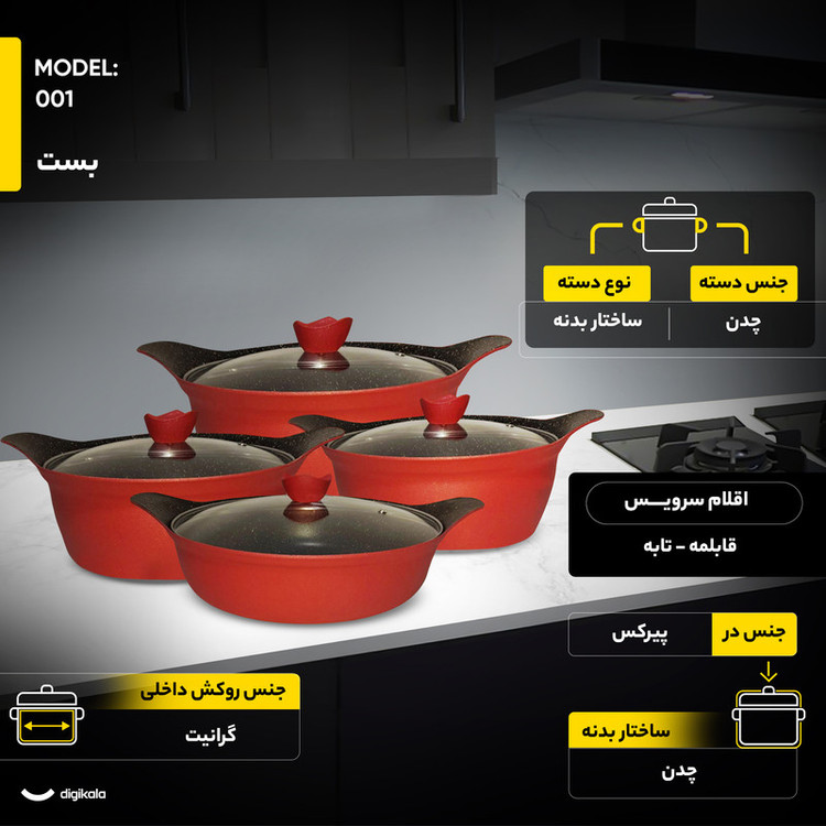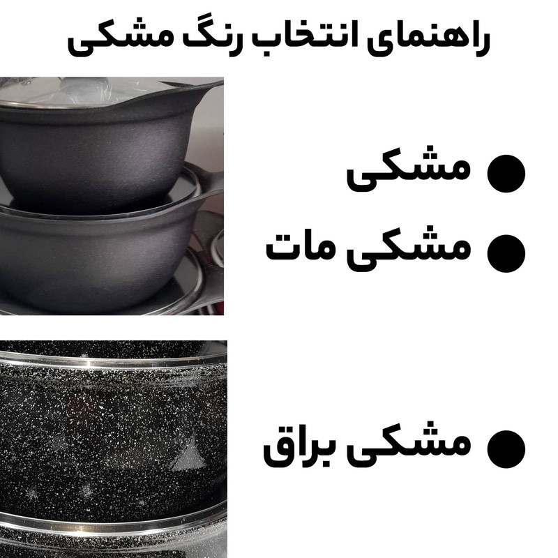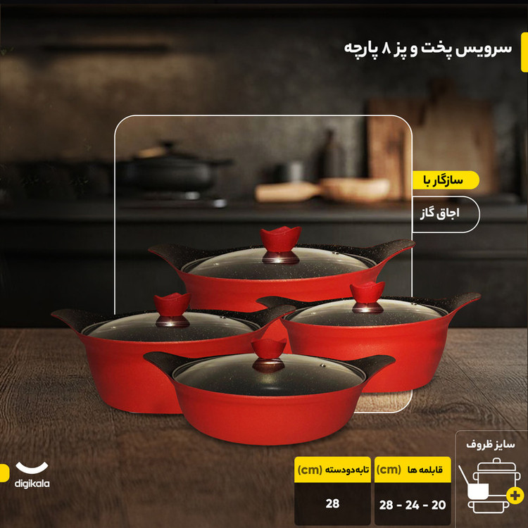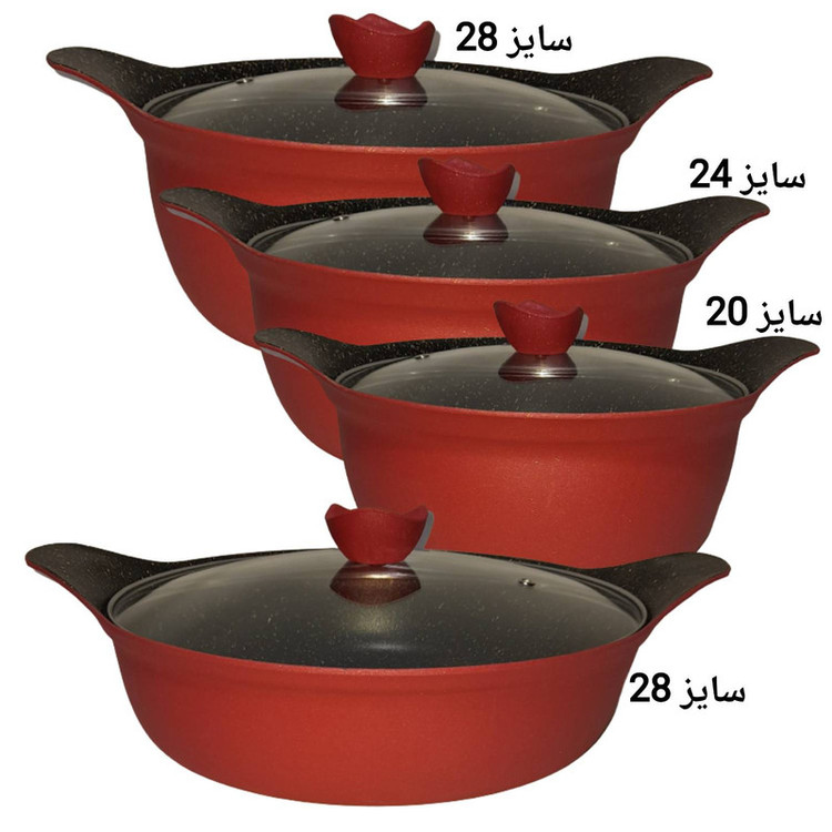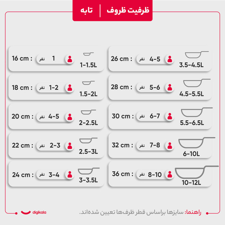 وزن ظروف: قابلمه سایز ۲۰: 1045 گرم، قابلمه سایز ۲۴: 1500گرم، قابلمه سایز ۲۸: 1935 گرم، تابه سایز ۲۸: 1565 گرم
