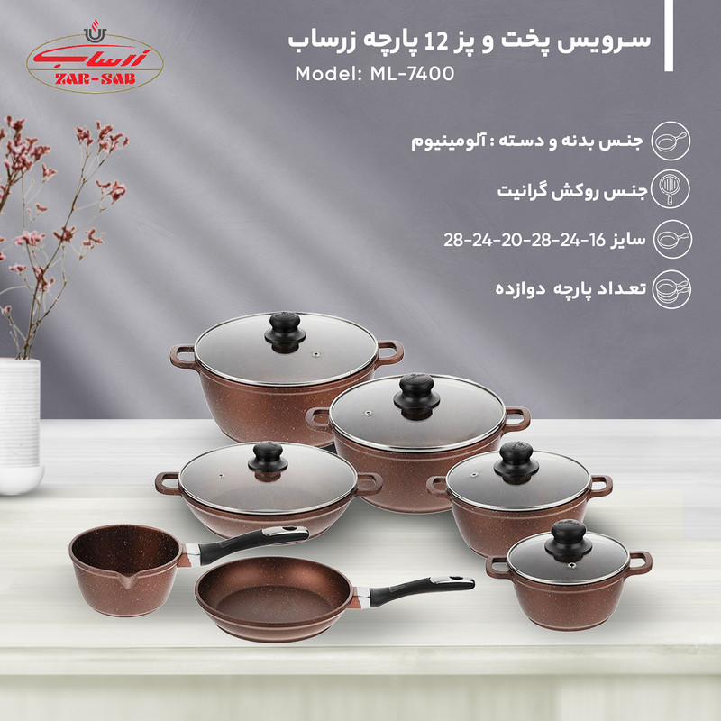 اگر به دنبال آشپزی سالم هستید یا رژیم غذایی خاصی را دنبال میکنید، باید از ظروفی استفاده کنید که این امر را برایتان فراهم سازند. ظروفی که میزان مصرف روغن را به حداقل رسانده و کیفیت مواد غذایی را حفظ کنند. سرویس پخت و پز 12 پارچه زرساب مدل ML-7400، از جنس آلومنیوم بوده و دارای روکش گرانیت هستند؛ همین مورد باعث نچسب بودن و افزایش سختی و مقاومت در برابر خط و سایش میشود. سرخ کردن انواع مواد غذایی در این محصول نیازی به روغن فراوان ندارد و با کمترین میزان روغن هم میتوان به غذایی ترد و مغزپخت دست یافت. این محصول بسیار مناسب برای پخت و پز و با مقاومت بسیار زیاد و طول عمر بالا است. قابلیت انتقال گرما به صورت یکنواخت به کل قابلمه و قابلیت شستوشو در ماشین ظرفشویی از ویژگیهای این محصول است. در پوشش خارجی این ظروف از رنگ با کیفیت و مقاوم در برابر حرارت استفاده شده است به نحوی که به مرور زمان یا با استفاده طولانی مدت، رنگ خارجی آنها تغییر نکند. این سرویس 12 پارچه بوده و اجزای مورد نیاز شما برای آشپزی را دارد.