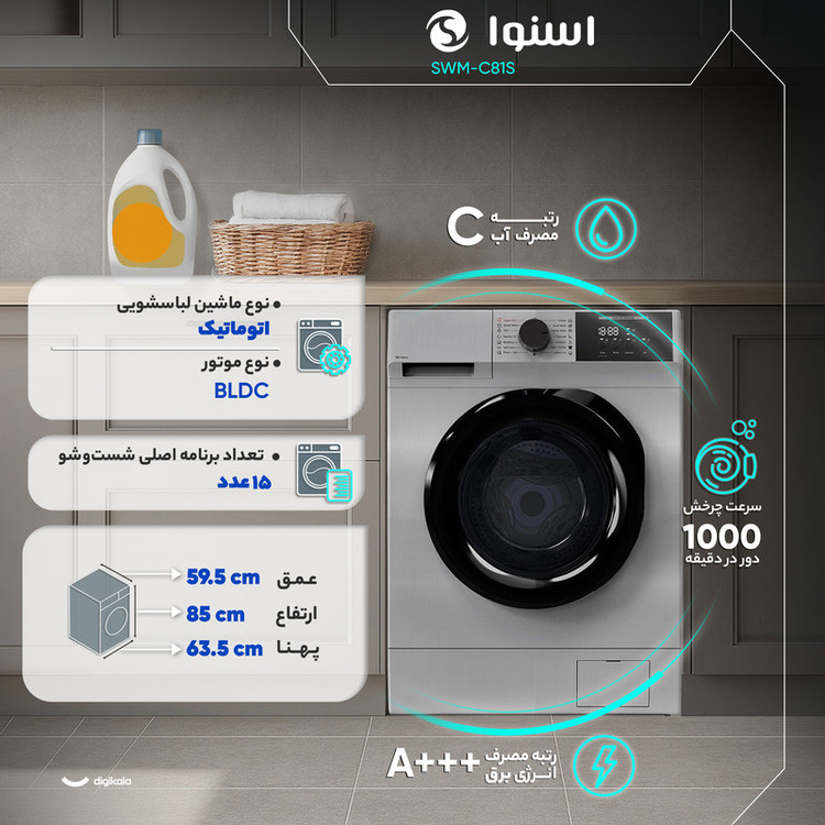ماشین لباسشویی ۸ کیلوگرمی اسنوا مدل SWM‑C81S با ترکیب موتور کممصرف BLDC، گرید انرژی +++A و طراحی دیگ لانهزنبوری، برای شستوشوی روزانه با بار متوسط تا نسبتاً زیاد ساخته شده است. این ظرفیت امکان شستوشوی همزمان لباسهای روزمره، حولهها و حتی چند تکه بزرگ مانند ملحفه یا روکش روتختی را فراهم میکند.