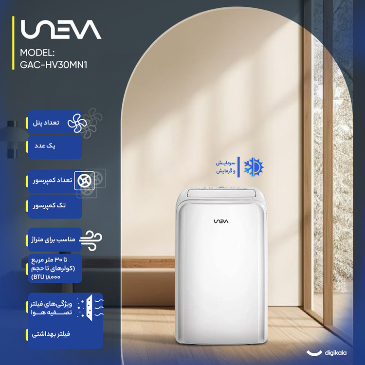 کنترل کامل تنظیمات دما و فن , تنظیم جهت پرتاب باد از راه دور , طراحی ارگونومیک و سبک , تنظیم تایمر از طریق ریموت
