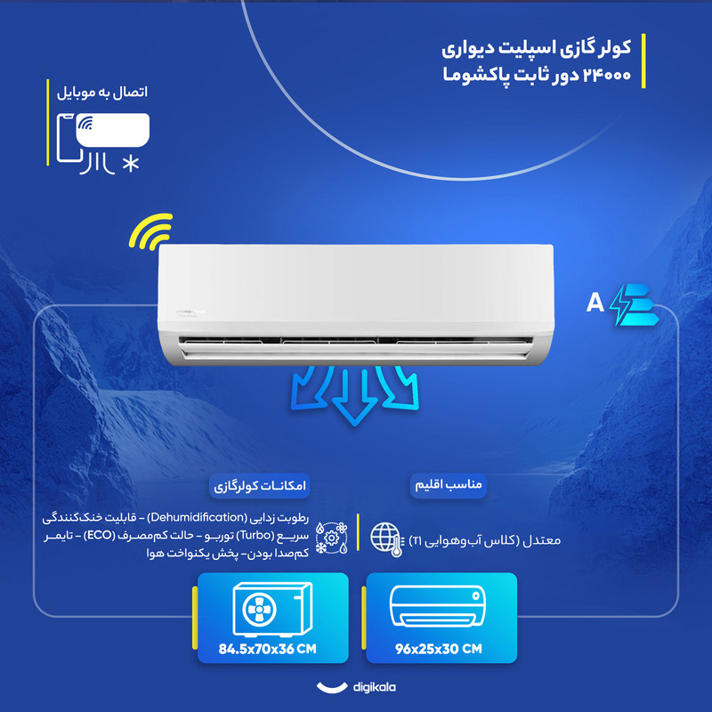 نمایشگر دیجیتال روی ریموت , کنترل کامل تنظیمات دما و فن , تنظیم تایمر از طریق ریموت , تنظیم جهت پرتاب باد از راه دور , قابلیت تنظیم حالت توربو از ریموت , طراحی ارگونومیک و سبک