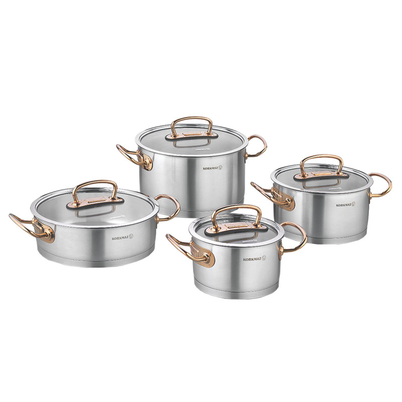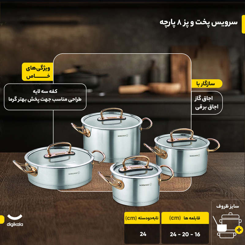 سرویس پخت و پز ۸ پارچه کرکماز مدل پرولاین از استیل ضدزنگ ۱۸/۱۰ ترکیهای ساخته شده و شامل سه قابلمه همراه درب در ابعاد ۱۶، ۲۰ و ۲۴ سانتیمتر و یک تابه دربدار ۲۴ سانتیمتری است. ساختار کف سهلایه کپسولی با ضخامت ۸ میلیمتر گرما را بهصورت یکنواخت در سطح ظروف پخش میکند و باعث میشود پخت غذا سالمتر و سریعتر باشد.