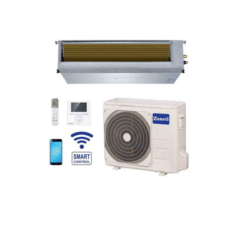 داکت اسپیلت اینورتر مدل ZMDA - 24HD1RANA زانتی دارای گاز R410A سازگار با محیط زیست با ویژگی های پیشرفته و طراحی متفکرانه است که به شما کمک می کند راحت تر نفس بکشید.فیلترهای داخلی به جذب ذرات گرد و غبار و آلودگی کمک می کند.داکت اسپلیتهای زانتی با رعایت اصول کیفیت و استانداردهای جهانی ساخته میشوند. به عبارتی، شرکت زانتی ایتالیا با بهکارگیری قطعات فنی روز دنیا موفق به ساخت محصولات باکیفیتی شده است. این تولید حرفهای نیز باعث قرارگیری محصولات زانتی در لیست پرفروشترین داکت اسپلیتهای بازار شده است. داکت اسپلیت 24000 زانتی مدل ZMDA - 24HD1RANA راندمان بسیار بالایی دارد و بسیار کم مصرف است. این داکت اسپلیت حتی در زمان اوج گرما نیز عملکرد درخشانی داشته و خیلی خوب میتواند دمای هوا را کاهش دهد. همچنین، سیستم Turbo دستگاه به انتقال سریع هوای خنک در محیط کمک میکند. کم صدا و کم مصرف بودن نیز از دیگر مشخصات داکت اسپلیت زانتی است. به علاوه، امکان کنترل دستگاه از راه دور باعث کاربری آسان آن شده است.به طوری که دستگاه دارای سیستم WIFI می باشد که قادر است به شبکه اینترنت جهانی وصل شده و شما آن را از راه دور نیز کنترل کنید. به طور کلی، نصب، سرویس و نگهداری از داکت اسپلیت زانتی ساده و راحت است. از سایر امکانات و مشخصات آن میتوان به داشتن اواپراتور و کندانسور طلایی، فیلتر قابل شستشو، سیستم Auto Restart و… اشاره کرد. از این داکت اسپلیت پرقدرت میتوان در انواع پروژههای مسکونی، تجاری، اداری و… استفاده کرد. از بهترین مزایای این نواع داکت اسپیلت می توان به این گونه موارد اشاره کرد:1-دارای تکنولوژی فول اینورتر (کمپرسور اینورتر -موتور فن اینورتر)بسیار قدرتمند 2-این نوع داکت اسپیلت ها هوایی را که میخواهد به محیط انتقال دهد فیلتر میکند و هوای تازه و مطبوعی به محیط میدهد. 3-دارای استقلال کامل است و به تنهایی می تواند گرما و سرمای یک محیط را تامین کند .راندمان سرمایشی و گرمایشی در مقایسه با سایر سیستم های تهویه مطبوع بهتر است. 4-از کانال های کوچکتری نسبت به کانال های کولرآبی استفاده می شود. همانطور که می دانید این سیستم مانند سایر اسپلیت های کانالی دیگر باید در واحد هایی که سقف کاذب دارند نصب شود تا داکت ها از بین فاصله دو سقف رد شده و هوا را به کل محیط برسانند.