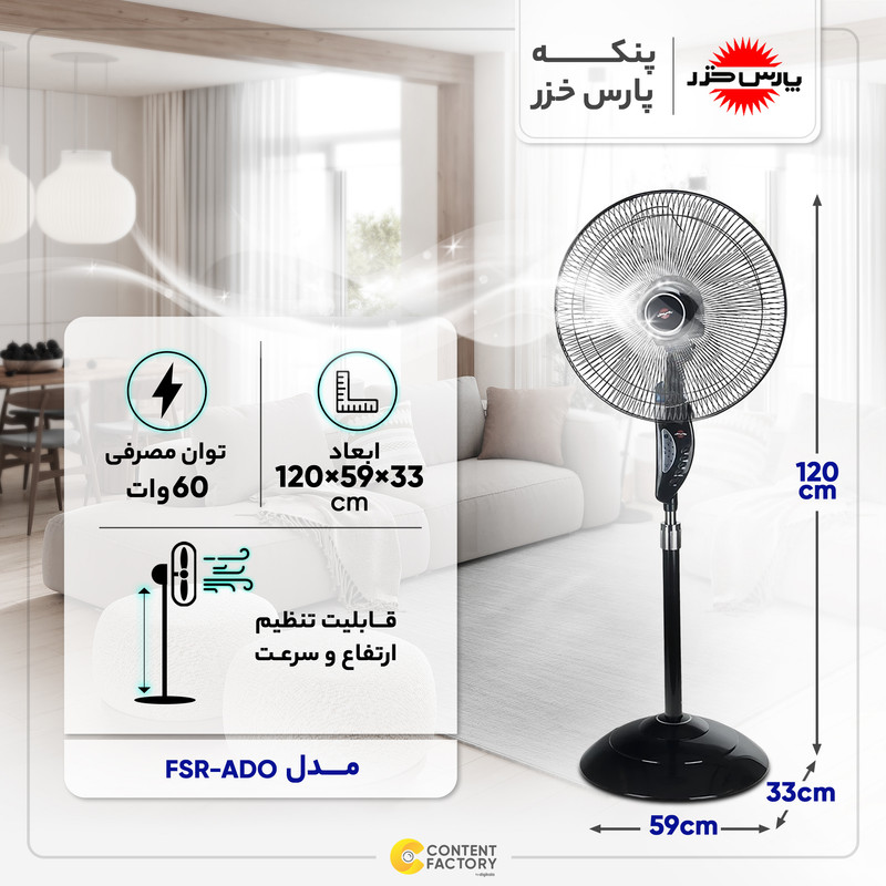 پنکه پارسخزر مدل FSR-ADO در گروه پنکههای پایهدار و ایستاده عرضه شده است. این محصول ظاهری زیبا و کارآیی بالایی دارد. توان بالای موتور باعث راندمان کاری بالای پنکه پآیه بلند شده است. این پنکه قابلیت تنظیم ارتفاع به صورت دستی را دارد. حجم باددهی بالای دستگاه باعث میشود تا هوا در فضای بزرگی به جریان درآید و تهویه مناسبی داشته باشد. پنکه پارس خزر مدل FSR-ADO از تایمر هم بهره میبرد. این مدل دارای گارد محافظ میلهای است تا از برخورد احتمالی با پرهها جلوگیری شود و خطری برای کسی ایجاد نشود. این محصول دارای قابلیت تنظیم آسان زاویه وزش باد به صورت جغجغه ای است. قابلیت تنظیم گردش افقی از طریق ریموت دستگاه ممکن است. حالت ریتم جهت دستیابی به وزش باد ملایم در نظر گرفته شده است که یکی از ویژگیهای خزر آدو است. ریموت کنترل دستگاه امکانی بسیار مهم در پنکه پارس خزر مدل fsr-shiba است که باعث راحتی بیشتر کاربر میشود. طراحی پنکه پارس خزر مدل 4060 طوری است که ایستایی خوبی داشته و پایه طراحی شده برای آن مانع از افتادن در اثر برخورد یا تکانهای کوچک میشود. پارس خزر از شرکتهای قدیمی تولید و عرضهکننده لوازم خانگی برقی است که همواره برای خریداران گزینههای مناسبی ارائه کرده است. برای خرید پنکه پارس خزر مدل fsr-ado کافیست آن را در سایت ديجي كالا به سبد خرید خود اضافه کنید و درب منزل تحویل بگیرید.