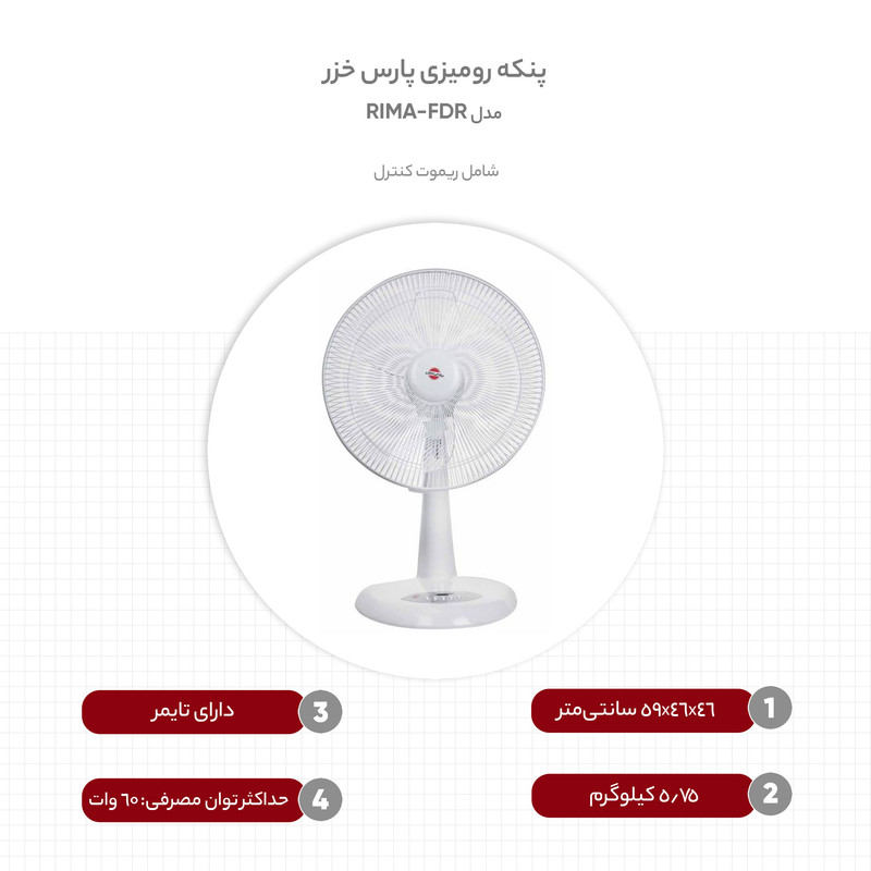 پنکه رومیزی پارسخزر مدل RIMA-FDS در گروه پنکههای پایهدار و رومیزی عرضه شده است. این محصول ظاهری زیبا داشته و کارآیی بالایی دارد. توان بالای موتور باعث راندمان کاری بالای دستگاه شده است. این پنکه دارای کلید تنظیم سرعت در سه حالت بهصورت لمسی با نشانگر LED است. حجم باددهی بالای دستگاه باعث میشود تا هوا در فضای بزرگی بهجریان درآید. پنکه رومیزی پارس خزر مدل RIMA-FDRاز تایمر هم بهره میبرد. این مدل دارای گارد محافظ میلهای است تا از برخورد احتمالی با پرهها جلوگیری شود و خطری برای کسی ایجاد نشود. این محصول دارای قابلیت تنظیم آسان زاویه وزش باد بهصورت جغجغهای است. حالت ریتم جهت دستیابی به وزش باد ملایم در نظر گرفته شده است که یکی از ویژگیهای این محصول است. طراحی دستگاه طوری است که ایستایی خوبی داشته و پایه طراحی شده برای آن مانع از افتادن در اثر برخورد یا تکانهای کوچک میشود. پارسخزر از شرکتهای قدیمی تولید و عرضهکننده لوازم خانگی برقی است که همواره برای خریداران گزینههای مناسبی ارائه کرده است.