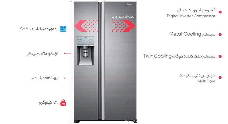 یخچال و فریزر مدل «FSR12» از گروه یخچال و فریزرهای سایدبایساید شرکت معتبر «سامسونگ» است. این دستگاه با گنجایش کلی بیش از 30 فوت، مناسب استفادهی خانوادههای کمجمعیت تا متوسط است. مصرف انرژی A++ این دستگاه، آن را در گروه دستگاههای کممصرف قرار میدهد. ظاهر زیبای این دستگاه با همراهی دو دستهی عمودی ِساده تکمیل میشود. پنل کنترلی دستگاه برای انتخاب یخ یا آبخنک و... روی در فریزر نصب شده است. این قسمت دارای یک پدال زیبا و بادوام است تا دسترسی به آب و یخ راحتتر شود. کمپرسور این دستگاه از نوع Digital Inverter Compressor (کمپرسور اینورتر دیجیتال) است که باعث افزایش عمر و بهبود راندمان دستگاه میشود. داخل یخچال طبقات متعدد و کشوهایی در نظر گرفته شده است تا مواد غذایی و ظروف مرتب چیده شوند. طبقهای برای قرارگیری بطری بهصورت افقی نیز داخل یخچال قرار دارد. سمت داخلی در هم دارای طبقاتی است که میتوان مواد غذایی و بطریها را در آنها قرار داد. وجود طبقات متعدد و کشو در فریزر هم باعث منظمشدن و کارآمدترشدن فضای فریزر میشود. روی در فریزر هم سه طبقه در نظر گرفته شده است و قسمت بالایی در، برای یخسازی استفاده میشود. برای تولید یخ و استفاده از آبسردکن، دستگاه باید به شیر آب شهری متصل شود. طبقات انعطافپذیر FSR12 امکان تغییر فضای ذخیرهسازی را برای کاربر فراهم میآورد. این طبقهها بهراحتی جدا شده و به بالا و پایین حرکت میکنند تا با هر سایزی از مواد غذایی و ظروف مختلف هماهنگ شوند. کشوهای عمیق سایدبایساید سامسونگ، فضای ذخیرهسازی بسیار بیشتری را برای یخچال و فریزر فراهم میآورد. عمیقتر و بزرگتربودن این کشوها امکان میدهد تا بتوان مواد غذایی را بهسادگی در کشو قرار داد و از آن خارج کرد. شرکت سامسونگ مشتریان زیادی را به سمت خود کشانده و با ارائهی خدمات پس از فروش مناسب، آنها را راضی نگه داشته است.