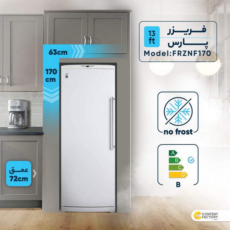 فریزر نوفراست 1700 مدل «FRZNF170» از محصولات کاربردی و باکیفیت ساخت این شرکت است که میتواند به صورت تکی یا به همراه یخچالهای تککاره و به صورت دوقلو مورد استفاده قرار بگیرد. فریزر نوفراست 1700 دستگاهی تکدرب است و فضای داخلی آن توسط چند کشو تقسیمبندی شده است. این فریزر گنجایش257 لیتر را دارد و به 8 طبقه تقسیم شده است. دو کشوی دراوری کوچک فریزر میتوانند برای ذخیرهسازی مواد کم حجمتر مورد استفاده قرار بگیرند. این فریزر دارای قابلیت تنظیم دما به صورت الکترونیکی است. این فریزر از قابلیت انجماد سریع بهرهمند است که با ایجاد سرمایش زیاد، علاوهبر محافظت از مواد غذایی قبلی، موجب یخزدن سریع غذاهایی میشود که به تازگی درون دستگاه قرار میگیرند. گفتنی است شرکت پارس از شرکتهای شناختهشده در تولید و عرضهی انواع محصولات و لوازم خانگی بهویژه لوازم برقی خانگی است که طی سالها، با عرضهی محصولاتی که از بیشترین کیفیت و کمترین قیمت را دارد به یکی از برترین و محبوبترین برندهای این گروه محصولات تبدیل شده است.