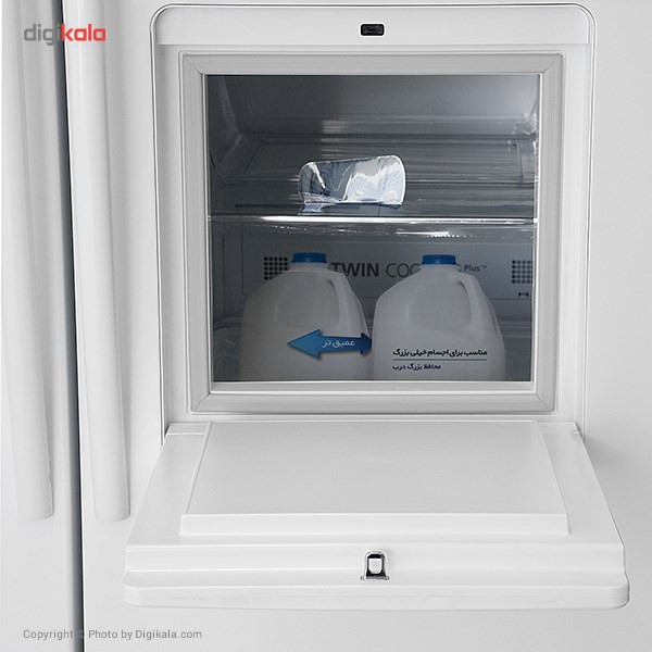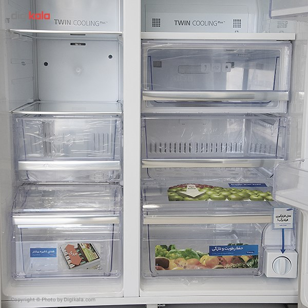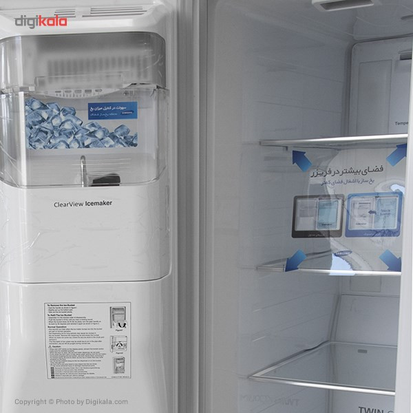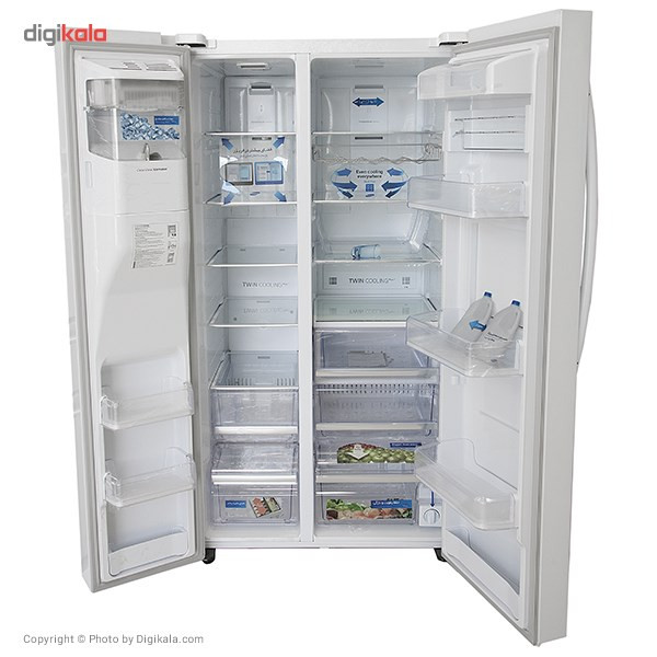 یخچال فریزر سامسونگ RS12SW از یخچالهای سایدبایساید شرکت سامسونگ (Samsung) است که از طراحی زیبا و امکانات مدرنی برخوردار است و به رنگ سفید تولید و عرضه شده است. این دستگاه که از کمپرسور اینورتر دیجیتال بهره میبرد مزایای قابلتوجهی نسبت به مدلهای قدیمیتر دارد که عبارت است از، کاهش قابلتوجه مصرف برق، کاهش استهلاک و افزایش طول عمر دستگاه، کاهش صدای تولیدی دستگاه و افزایش ماندگاری مواد غذایی. قابلیت مدرن این یخچال که با عنوان CoolSelect Zone™ یا محفظه یخچال در یخچال شناختهشده است این امکان را میسر میسازد تا ضمن نگهداری مواد غذایی دلخواه در آن یکی از حالات سرمایش تعریف شده و متناسب با آن ماده را انتخاب کنید. این مدل ضمن برخورداری از سیستم خنککننده دوگانه یا مجزا برای دو بخش یخچال و فریزر رطوبت و دمایی کاملاً ویژه هر یک از این بخشها را تنظیم میکند تا در یخچال با رطوبتی نسبتاً بیشتر ماندگاری میوه و سبزیجات را افزایش داده و در بخش فریزر ضمن ایجاد رطوبتی کمتر کیفیت اغذیه و گوشت را حفظ نموده و در بوزدایی نیز عملکرد بهتری را خواهد داشت تا دیگر نگران نگهداری گوشت و ماهی در کنار دیگر مواد غذایی در فریزر نباشیم. محفظه بار از دیگر ویژگیهای این یخچال است که در یخچالهای معمولی کمتر دیده شده و به کاربر اجازه دسترسی سریع به نوشیدنی یا مواد غذایی پرمصرف را میدهد و نهتنها به سهولت استفاده میانجامد بلکه از اتلاف انرژی نیز جلوگیری میکند. یخچالفریزر سامسونگ RS12SW از یخساز خودکار نیز برخوردار است و محفظه مربوطه که بر روی درب فریزر تعبیهشده نسبت به دیگر مدلها عریضتر و بلندتر ساختهشده تا کاربر قادر به استفاده از ظروف پهنتر و یا لیوان بلندتر نیز باشد. در قسمت بالای این آبریز هم یک صفحه نمایشگر LED قرارگرفته که به مصرفکننده اجازه بررسی و تغییر تنظیمات گوناگونی نظیر دمای یخچال و فریزر را میدهد. استفاده از فناوری Space Max در طراحی این مدل نیز موجب گشته تا فضای داخلی بیشتری در اختیار مصرفکننده قرار گیرد. فیلتر آب و اخطار بازماندن درب از دیگر مشخصات این مدل است.