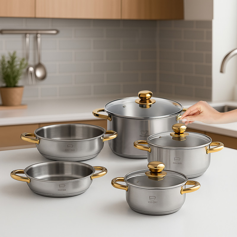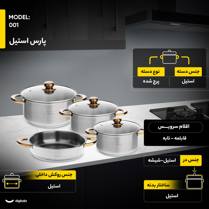 وزن ظروف: قابلمه سایز ۲۴: 1940 گرم- قابلمه سایز ۲۰: 1340 گرم - قابلمه سایز ۱۶: 920 گرم- تابه سایز ۲۴: 1745 گرم- تابه سایز ۲۰: 1175 گرم