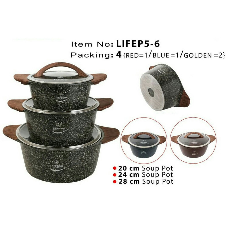 سرویس قابلمه چدن-گرانیت لایف اسمایل مدل P6 دارای سه عدد قابلمه چدنی در اندازه های28- 24 - 20 درب شیشه ای بسیار بادوام و دسته های نسوز (دسته های قابلمه های از جنس چوبی) میباشد . این سرویس قابلمه کیفیت ساخت بسیار بالایی دارد . کفه بیرونی قابلمه طوری طراحی شده است که گرما را بسیار سریع جذب خود کرده و در نتیجه قابلمه سریعتر از سایر قابلمه ها داغ خواهد شد و مزیت دیگر آن این است که طراحی فوق العاده کف بیرونی آن باعث می شود قابلمه مدتی تمام داغ بماند و در نتیجه غذای شما بعد از خاموش کردن شعله گاز مدتی داغ بماند . درب شیشه ای و شفاف از جنس پیرکس باعث می شود در هنگام پخت غذا براحتی محتویات قابلمه را مشاهده و مراحل پخت غذا را مشاهده کرد. پیرکس در مقابل حرارت بسیار مقاوم است . شستشوی بسیار راحت و تنها با یک ابر از مزایای ظروف گرانیتی است که استفاده از آن را بیش از پیش راحت کرده است.