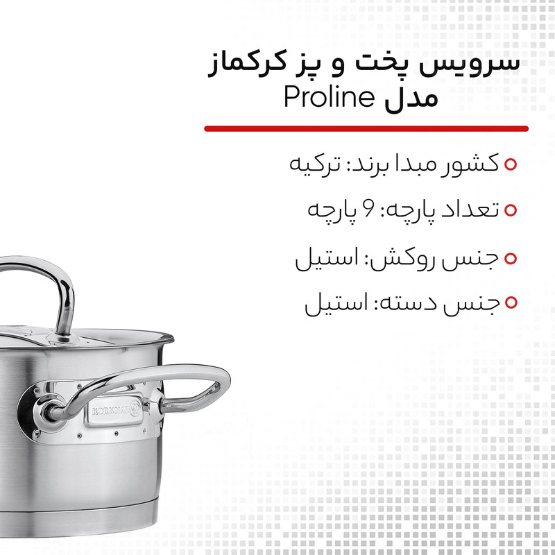 سرویس قابلمه کرکماز مدل Proline یک سرویس زیبای 9 پارچه از برند کرکماز می باشد که دارای 3 قابلمه دربدار به گنجایشهای 2 ،4، 6.3 لیتر و سایزهای 16، 20، 24، یک ماهیتابه دسته دار به گنجایش 1.8 لیتر و سایز 24 و یک ماهیتابه درب دار با گنجایش 3.1 لیتر و سایز 24 سانتی متر است که دست شما را برای پخت و پز انواع غذاها باز نگه میدارد.