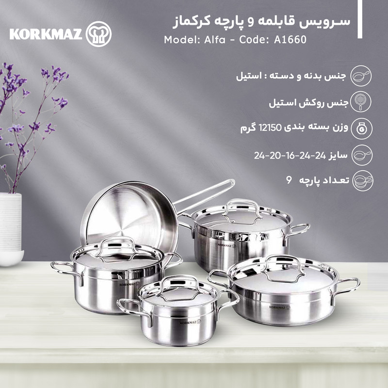 دستهبندی: سرویس پخت و پزتعداد پارچه: 9 پارچهوزن بستهبندی: 12.15 کیلوگرمکشور مبدا: ترکیهاقلام سرویس: قابلمه , تابه
