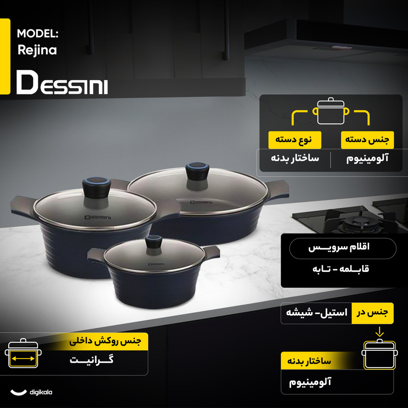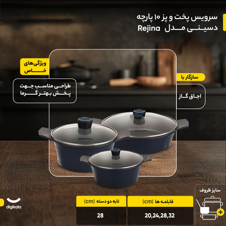 وزن ظروف: قابلمه سایز ۳۲: ۲۳۰۰ گرم، قابلمه سایز ۲۸: ۱۹۸۰ گرم، قابلمه سایز ۲۴: ۱۵۸۵ گرم، قابلمه سایز ۲۰: ۹۴۵ گرم، تابه سایز ۲۸: ۱۹۱۰گرم